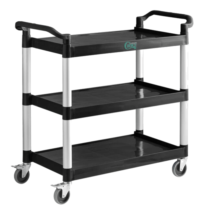 A sturdy three-shelf bussing cart built for event settings, designed to speed cleanup and move dishes, trays, glassware, and supplies from tables to dish areas with minimal effort; it features deep, raised-edged plastic shelves that help contain spills, tubular metal support posts for strength, easy-grip handles on each end, and smooth swivel casters (two with brakes) so staff can steer through crowded rooms and lock the cart in place when needed — a practical, low-maintenance workhorse for banquet halls, catering shifts, concession stands, and busy event breakdowns.
