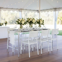 Description: The Nexus Communal Table features a sharp silver frame paired with a bold black tabletop, offering a modern and refined centerpiece designed to bring people together at any event.