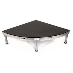 A 4-foot quarter-round stage panel with a 12-inch height — a sturdy, space-saving curved corner piece that lets you build rounded or pie-shaped stages for ceremonies, performances, and presentations. The top is covered in a textured, non-slip surface for performer safety, while the aluminum frame and removable adjustable legs provide solid support and easy setup. Use it as a corner segment to create arcs, semi-circles, or custom stage shapes when paired with other panels; it connects cleanly to standard stage sections and tucks neatly into a curved stage layout. Durable, lightweight, and designed for rental use, this panel makes creating elegant, smooth stage edges simple and reliable.