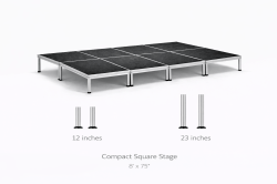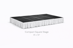 A sturdy, professional 8' x 15' event stage built from modular panels — perfect for presentations, performances, ceremonies, or DJ setups where a compact, reliable platform is needed. The deck sits at a 12-inch height using adjustable stage legs and features a durable, non-slip surface and an aluminum frame that packs flat for efficient transport and fast on-site assembly. Add optional accessories like a stage skirt for a polished look, guard rails for safety, and stairs for easy access. This setup gives you a clean, elevated focal point that’s stable, easy to configure, and ideal for indoor or outdoor events that need a low-profile stage solution.