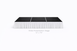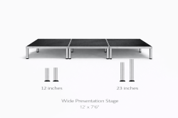 A sturdy, professional presentation stage sized at 12' x 7'6" that creates a clean, elevated platform for speakers, performers, awards ceremonies, product demos, or photo ops. Built from modular stage panels on a heavy-duty aluminum frame, this stage assembles quickly and supports a stable, level surface for presenters and equipment. Available with 23" legs for a mid-height stage (also compatible with shorter 12" legs if needed), plus optional accessories like stairs, guard rail, and a 12" high white skirt for a finished look. Ideal for conferences, school events, corporate meetings, and small to medium performances where a compact, reliable stage is required.
