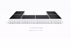A versatile U-shaped portable stage designed to give your presenters, performers, or honored guests a raised, professional platform. Built from modular stage panels and adjustable legs, this configuration forms an open-front U roughly 12' x 15' using the supplied panels and is shown here with taller 23" legs to create a higher performance surface. The clean black deck and aluminum frame present a neutral, professional look that suits ceremonies, fashion runways, panel discussions, break-out performances, or product demonstrations. Optional accessories include guard rails for crowd or performer safety, a stair unit for easy access, and a white 12" stage skirt that hides the underside for a finished appearance. Because the stage is assembled from standard panels, it can be reconfigured, skirted, and accessorized to fit your event flow while providing a stable, elevated platform for talent and presenters.