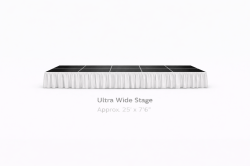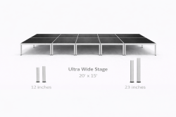 A sturdy, professional event stage measuring 20' x 15' and built to a 12" height, designed to host speakers, performers, presentations, or ceremony focal points with confidence. The stage is constructed from interlocking panels on a rigid aluminum frame and supported by adjustable legs for a level, wobble-free surface on most floors. Its low-profile 12" height makes it easily accessible for guests and performers while still providing clear sightlines for small to mid-size audiences. Use it as a dance platform, band riser, presentation stage, award stand, or ceremony altar; it accepts optional accessories like stairs, safety rail, and a pleated stage skirt for a finished, professional look. Quick to assemble and versatile in placement, this stage gives your event a dependable, clean surface that reads well on camera and in person.