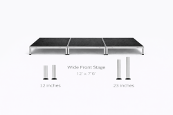 A sturdy, low-profile performance platform designed for front-of-house presentations, the Wide Front Stage provides a clean, professional surface for speakers, musicians, awards ceremonies, and school performances. Built from modular stage panels with an attractive dark top and rugged aluminum frame, this 12-foot-wide by 7-foot-6-inch-deep unit can be assembled with adjustable legs to create the listed 12-inch height. The platform accepts optional skirts for a finished look, and pairs easily with steps and guard rails when you need safe access or added protection at the edge. Quick to set up and broken down, the Wide Front Stage gives your event a reliable, level surface that looks polished on camera and comfortable underfoot.