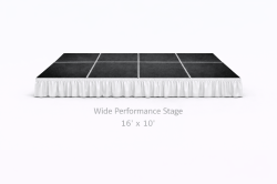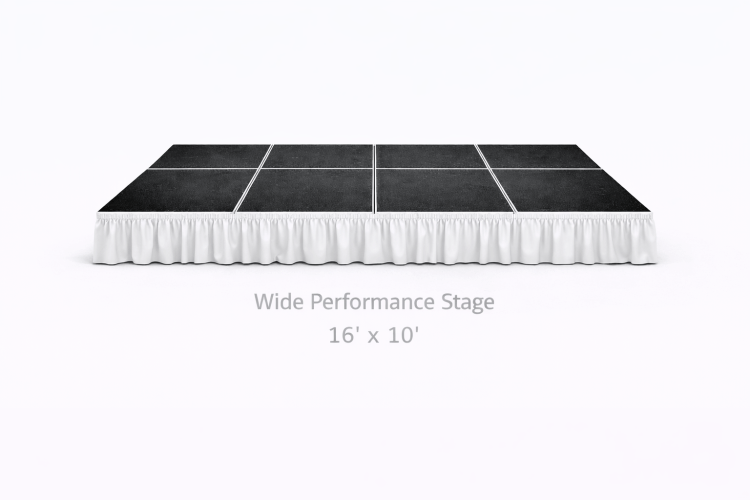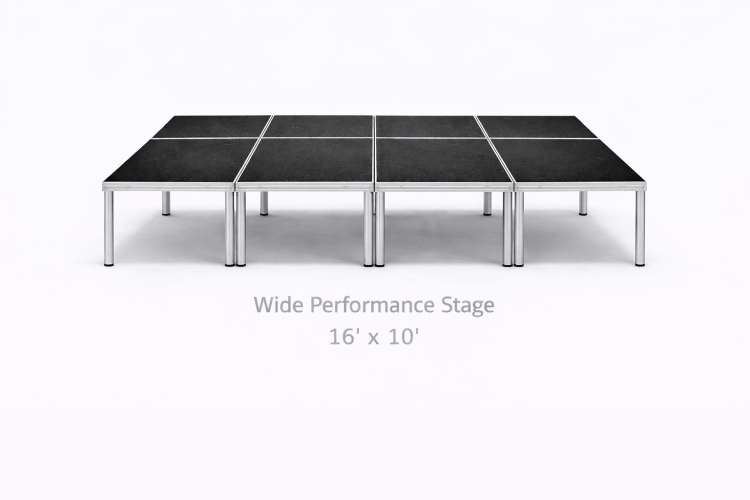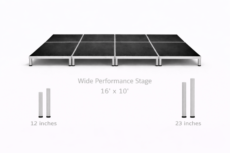 A sturdy, professional-grade stage platform that turns any space into a performance-ready focal point. Built from interlocking stage panels and supported by adjustable aluminum legs, this configuration creates a flat, dependable 16' x 15' surface raised 23 inches above the ground. The black, non-slip deck gives performers confident footing while the modular design lets technicians assemble, expand, or reconfigure the layout quickly to suit bands, speakers, ceremonies, fashion shows, or school productions.