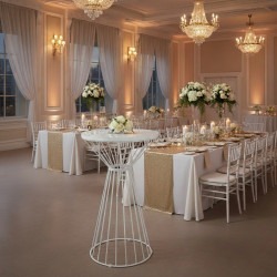 Elevate your event with the Aria Cocktail Table—a sleek, modern centerpiece featuring a clean white frame paired with a pristine white top. Its stylish design brings both form and function, offering the perfect blend of elegance and practicality to any setting.