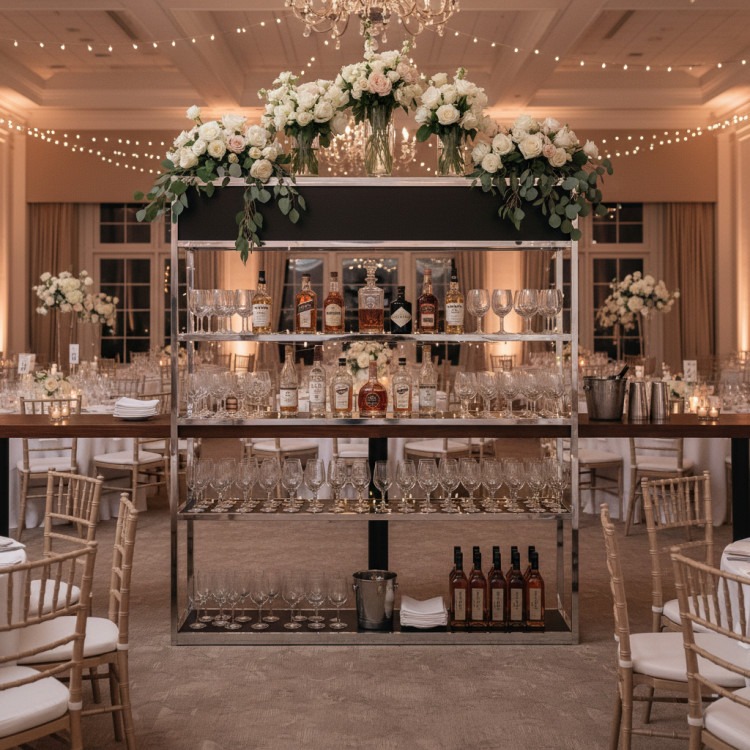 Elevate your event with the Phoenix Bar Back—a stylish rental piece designed to create an impressive backdrop. Its sleek silver frame with crisp white inserts not only offers visual appeal but also serves a functional role, giving your bar area a refined, modern edge perfect for any celebration.