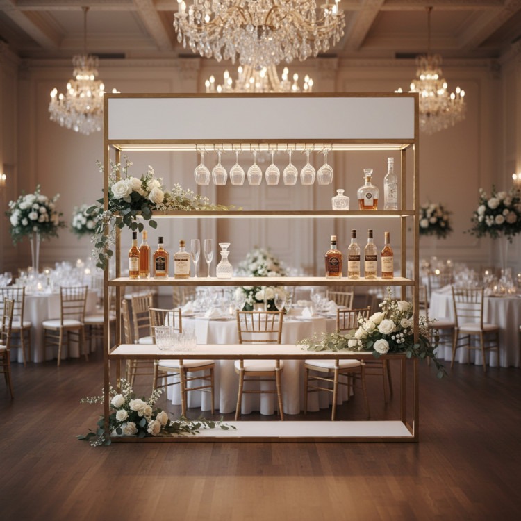 Elevate your event with the Phoenix Bar Back—a stylish rental piece designed to create an impressive backdrop. Its sleek silver frame with crisp white inserts not only offers visual appeal but also serves a functional role, giving your bar area a refined, modern edge perfect for any celebration.
