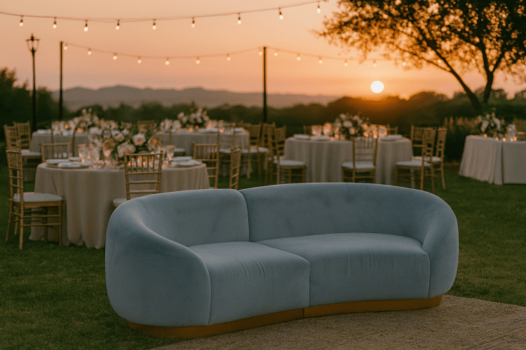 Fresh and serene, the Rain Loveseat features a soft blue tone and plush boucle texture. Chic and versatile, it enhances lounges, or event spaces with a calming, stylish presence.